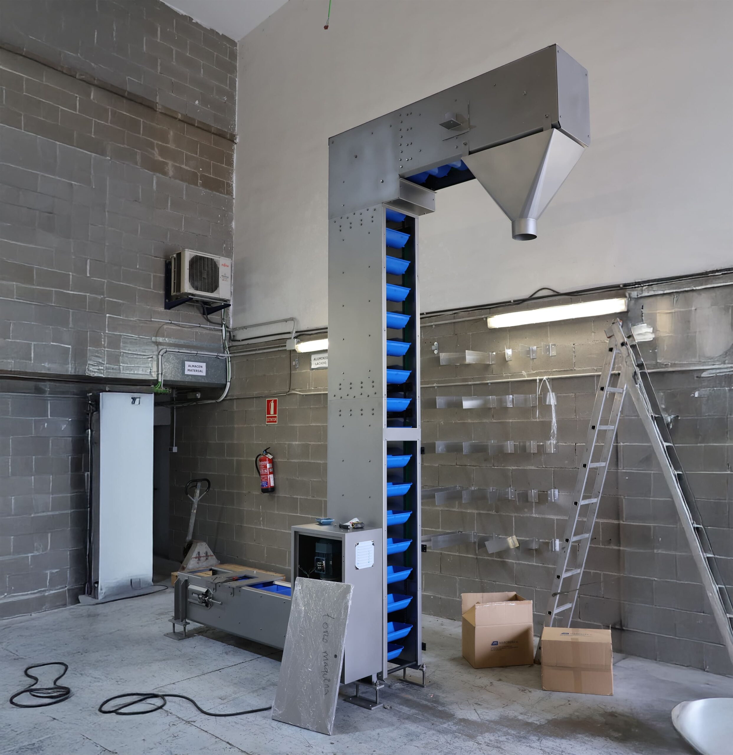 El elevador es compatible con una amplia gama de cangilones de fabricación propia, disponibles en distintos volúmenes y materiales, lo que permite adaptar el equipo a las características específicas del producto transportado.